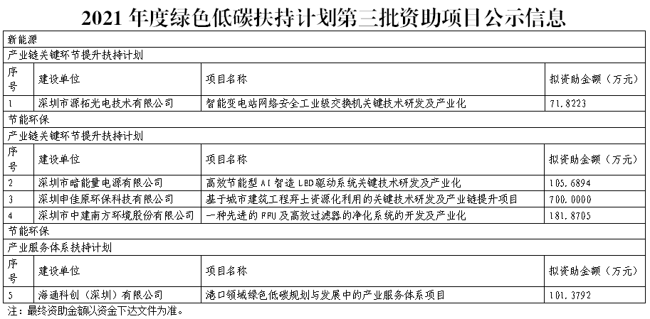 为加强对深圳市战略性新兴产业专项资金的管理,自觉接受社会各界的监督,现将2021年度战略性新兴产业专项资金绿色低碳扶持计划(第三批)资助项目计划在深圳市工业和信息化局网站和微信公众号上予以公示,向社会征求意见,欢迎社会各界监督。最终资助金额以资金下达文件为准。