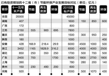 从《锦标赛》归纳的信息看,从2009年11月到今年2月,湖南、广西、江苏、重庆、山西、安徽、浙江、湖北、广东、上海、贵州和河南先后发布了地方版的节能环保产业规划。该报告预计地方十二五产值目标将大幅超越国家规划目标。