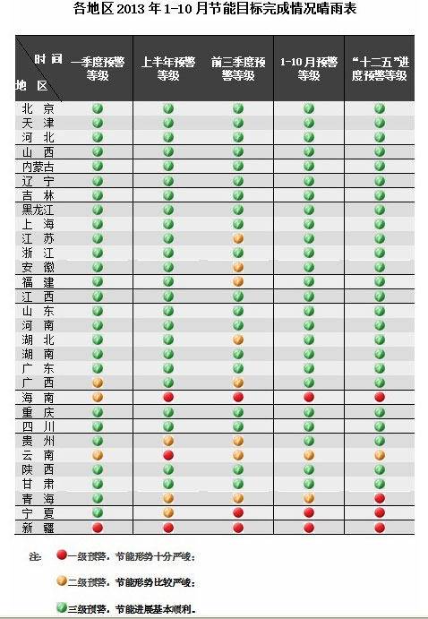 发改委对照各地“十二五”后三年年均节能任务,对各地区节能形势进行分析, 1-10月份,海南、宁夏、新疆等3个地区预警等级为一级(一级预警:节能形势十分严峻、二级预警:节能形势比较严峻,三级预警:节能进展基本顺利),节能形势十分严峻;云南、青海等2个地区预警等级为二级,节能形势比较严峻;北京、天津、河北、山西、内蒙古、辽宁、吉林、黑龙江、上海、江苏、浙江、安徽、福建、江西、山东、河南、湖北、湖南、广东、广西、重庆、四川、贵州、陕西、甘肃等25个地区预警等级为三级,节能工作进展基本顺利。西藏缺乏统计数据,没有进行预测。