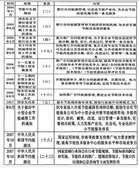 1998年由国家发改委、财政部、世界银行、全球环境基金等共同合作,在中国推广合同能源管理。世界银行/全球环境基金通过中国政府认可,以基金管理和项目运作独立并行的方式推动中国节能服务产业的发展。在此基础上,中国政府也相应的制定了涉及到合同能源管理的一系列政策和法规。主要如表一所示: