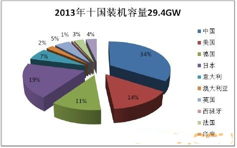 这一年说平常而又不平常,全球的光伏电站在不断的增长,而晶硅电池的产能过剩仍然在不断持续,供大于求的现象并没有得到有效的解决,之前欧洲国家在光伏市场的独领风骚时代已不复存在,德国更是被中国、日本和美国超越。下面,就是2013年全球主要光伏应用国家的装机情况: