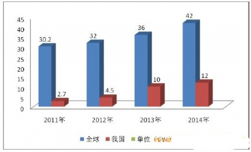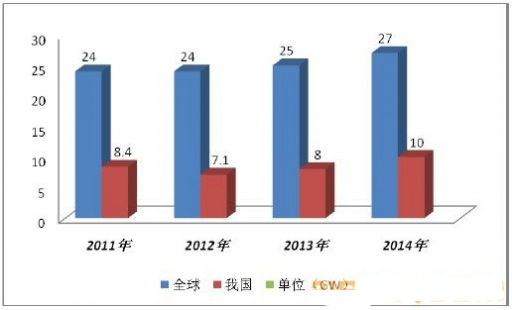2011-2014年我国光伏新增装机量及全球新增装机量