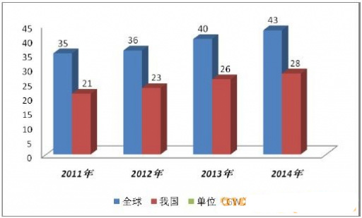 2011-2014年我国太阳能电池产量及全球太阳能电池产量