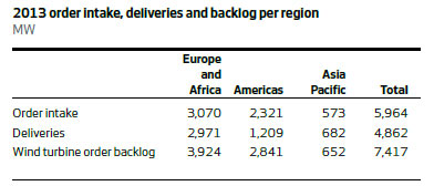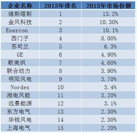 维斯塔斯的表现好于预期,维斯塔斯一度濒临倒闭,但是去年四季度已经显示出明显的复苏,这个复苏不仅表现在市场份额上,更表现在年度利润上(据维斯塔斯2014年2月3日发布的2013年年报显示,维斯塔斯2013年营业额达到了60.84亿欧元,不计特殊项目的息税前利润为2.11亿欧元,净现金流达到10.09亿欧元,均好于之前预期。当然,2013年度整体上依然处于亏损状态,亏损0.82亿欧元),而且随着全球最大功率8MW风机安装以及与三菱重工就海上风机组建合资公司,表明维斯塔斯基本上度过了这波劫难,开始了恢复。但是要想长期保持全球龙头地位已经越来越难了,因为中国公司正集群突破,越来越近了,一旦金风历史性超越维斯塔斯,后继将难以再翻转,因为金风与维斯塔斯相比,有着明显的成本优势。