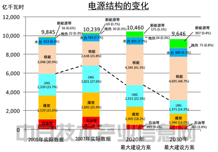 新计划虽然完全没有明确其他电源的导入目标,但对于可再生能源,还是表示“要超过以往的能源基本计划”,并且给出了“2020年达到1414亿千瓦时,2030年达到2140亿千瓦时”(含水力)的参考值。虽说是参考值,但单独为可再生能源设定最低目标的做法可以说意义重大。不过,相比2012年《革新性能源环境战略》提出的“到2030年达到3000亿千瓦时(不含水力为1900亿千瓦时)”的可再生能源建设目标,还是难以抹消政策倒退的印象。