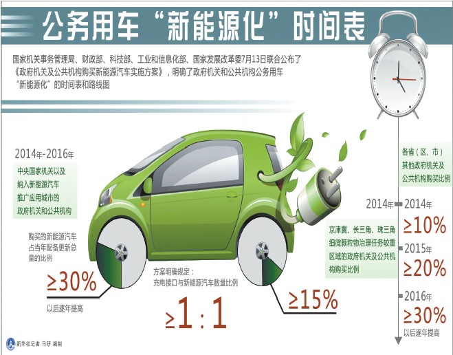 国家机关事务管理局、财政部、科技部、工业和信息化部、国家发展改革委13日联合公布了《政府机关及公共机构购买新能源汽车实施方案》,明确了政府机关和公共机构公务用车“新能源化”的时间表和路线图。