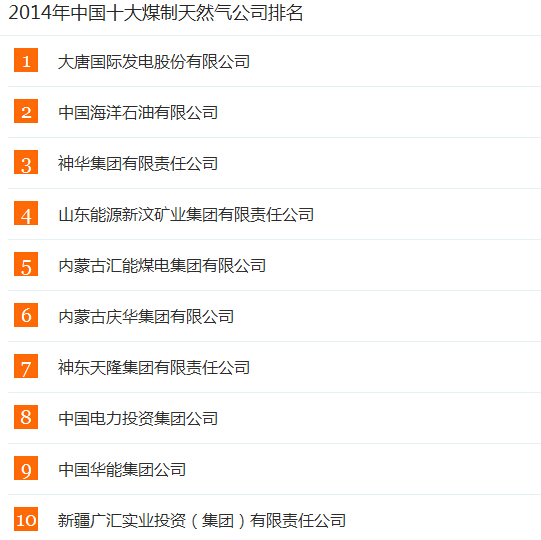前瞻产业研究院《2014-2018年中国煤制天然气行业市场前瞻与投资战略规划分析报告》统计数据显示,2014年中国十大煤制天然气公司排行榜如下: