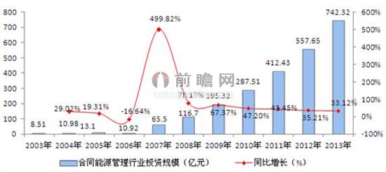 据前瞻产业研究院发布的《2014-2018年中国合同能源管理(EMC)行业发展前景与投资战略规划分析报告》数据显示,2003-2013年,我国合同能源管理行业投资规模不断扩大,复合增长率高达50.45%,说明行业发展迅速。2011年,我国合同能源管理行业投资规模为412.43亿元,同比增长43.45%;2012年,投资规模为557.65亿元,同比增长35.21%。