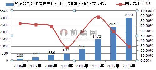 同时,全国运用合同能源管理机制实施节能项目的节能服务公司从最初的3家(北京EMCO、辽宁EMCO和山东),发展到2006年的133家,2012年进一步发展到2339家,比上年增加了867家,增幅达58.90%;2013年年初,国家税务总局、发改委联合发布《关于落实节能服务企业合同能源管理项目企业所得税优惠》,对实施节能效益分享型合同能源管理项目的节能服务企业实施税收优惠政策,这极大的促进了合同能源管理行业的发展,截至2013年年底,我国实施合同能源管理项目的工业节能服务企业数量约为3000家,同比增长28.26%。
