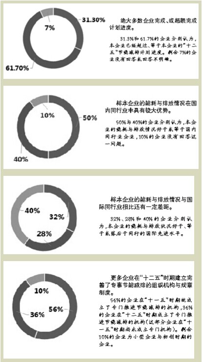 从本次企业调查来看,2013年,我国大多数企业的节能减排工作进展态势良好,企业在“十二五”期间更加重视节能减排工作,普遍投入大于“十一五”时期,更多企业建立了节能减排的专门工作机构,完善了相应的规章制度,普遍重视运用技术、管理与政策的综合手段开展节能减排。大多数企业完成或超额完成本企业及国家的节能减排目标。