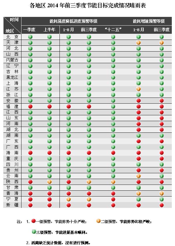 近日,国家发布了各地区2014年前三季度节能目标完成情况晴雨表。通过对各地区节能形势进行分析,对照各地“十二五”年均节能任务,前三季度,福建、海南、青海、新疆等4个地区预警等级为一级,节能形势十分严峻;陕西、宁夏等2个地区预警等级为二级,节能形势比较严峻;北京、天津、河北、山西、内蒙古、辽宁、吉林、黑龙江、上海、江苏、浙江、安徽、江西、山东、河南、湖北、湖南、广东、广西、重庆、四川、贵州、云南、甘肃等24个地区预警等级为三级,节能工作进展基本顺利。与1-8月相比,陕西由一级预警下降为二级预警。西藏缺乏统计数据,没有进行预测。