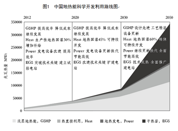 中国的地热工作者在中国工程院重点咨询研究项目《我国地热资源开发利用战略研究》中研究制订了中国地热能科学开发利用路线图,设计了至2020年、2030年、2050年3个时间节点的发展目标。