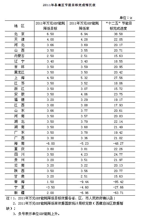 超额完成的地区有北京、天津、河北、山西、上海、山东、河南、湖北、四川、贵州10个省(市);完成的地区有吉林、黑龙江、安徽、湖南、广西、重庆、云南、陕西8个省(区、市);完成了年度节能目标但落后于“十二五”节能目标进度的地区有内蒙古、辽宁、江苏、福建、江西、广东6个省(区);未完成的地区有浙江、海南、甘肃、青海、宁夏、新疆6个省(区),其中青海因玉树地震灾害的影响未完成年度节能目标。