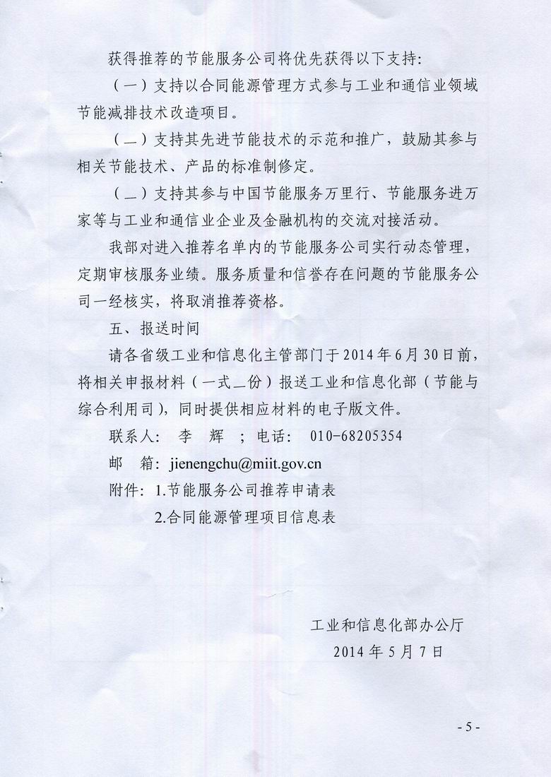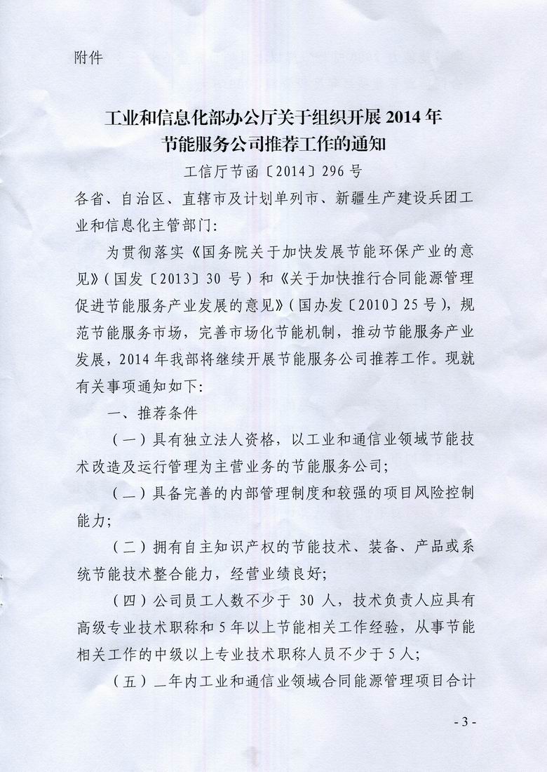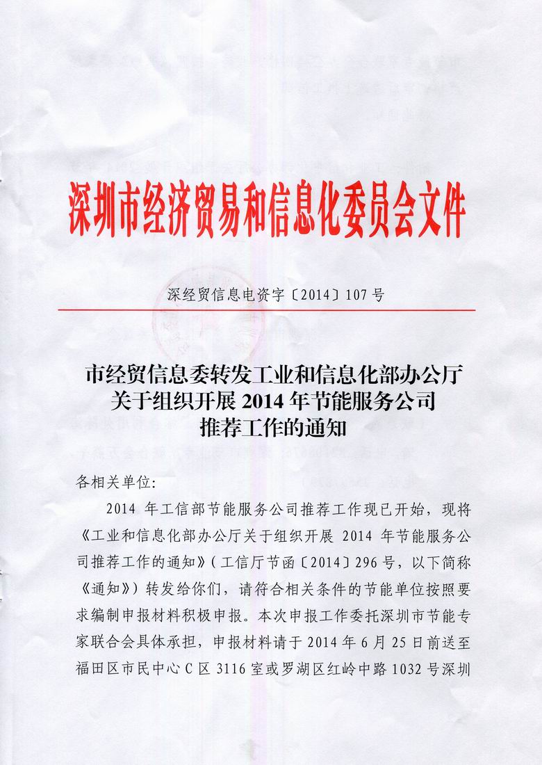 2014年工信部节能服务公司推荐工作现已开始,现将《工业和信息化部办公厅关于组织开展2014年节能服务公司推荐工作的通知》(工信厅节函〔2014〕296号,以下简称《通知》)转发给你们,请符合相关条件的节能单位按照要求编制申报材料积极申报。本次申报工作委托深圳市节能专家联合会具体承担,申报材料请于2014年6月25日前送至福田区市民中心C区3116室或罗湖区红岭中路1032号深圳市节能专家联合会办公楼四楼,我委将按照《通知》要求经严格初审后遴选上报工信部。