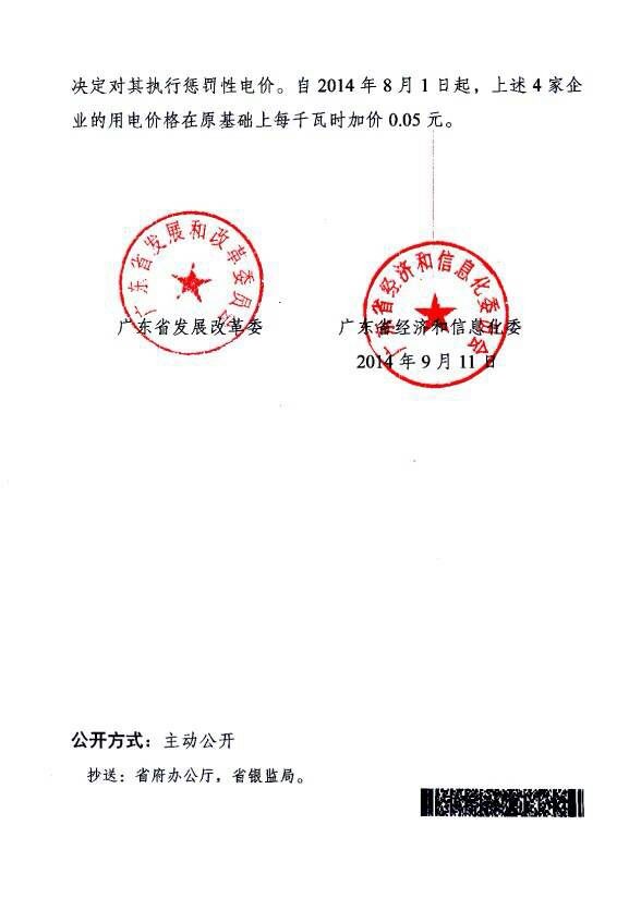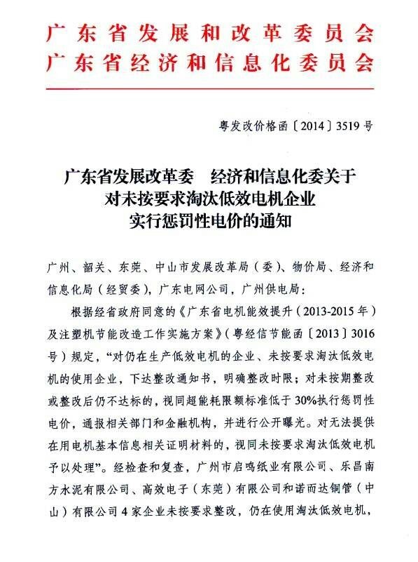 根据经省政府同意的《广东省电机能效提升(2013-2015年)及注塑机节能改造工作实施方案》(粤经信节能函〔2013〕3016号)规定,“对仍在生产低效电机的企业、未按要求淘汰低效电机的使用企业,下达整改通知书,明确整改时限;对未按期整改或整改后仍不达标的,视同超能耗限额标准低于30%执行惩罚性电价,通报相关部门和金融机构,并进行公开曝光。对无法提供在用电机基本信息相关证明材料的,视同未按要求淘汰低效电机予以处理”。经检查和复查,广州市启鸣纸业有限公司、乐昌南方水泥有限公司、高效电子(东莞)有限公司和诺而达铜管(中山)有限公司4家企业未按要求整改,仍在使用淘汰低效电机,决定对其执行惩罚性电价。自2014年8月1日起,上述4家企业的用电价格在原基础上每千瓦时加价0.05元。