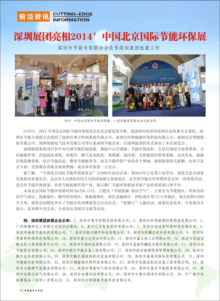 6月8日,2014'中国北京国际节能环保展览会在北京展览馆开幕。受深圳市经济贸易和信息化委员会委托,深圳市节能专家联合会组织了深圳市奥宇控制系统有限公司、深圳百时得能源环保科技有限公司、深圳达实智能股份有限公司、深圳易能电气技术有限公司等31家深圳节能企业,以深圳展团的形式参加了本次展览会。