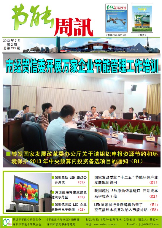 深圳市节能专家联合会、《节能技术与市场》编辑部编制的《节能周讯》(PDF电子周报),汇聚每周最新的深圳、国内和国际的节能行业新闻、行业资讯、节能技术、节能知识等,每期免费发送给相关政府部门、行业协会以及数千家节能企业。