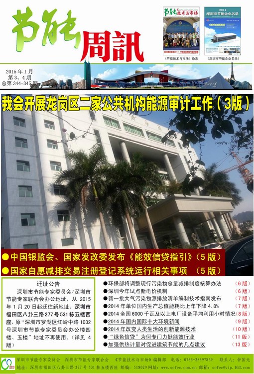 《节能周讯》2015年1月第3、4期,总第344、345期合刊PDF版(点击如下数字图标在线阅读,打开约需等待30秒,或右键“目标另存为”下载到电脑中阅读;如果不能正常打开,建议您的电脑安装PDF阅览器): 深圳市节能专家联合会、《节能技术与市场》编辑部编制的《节能周讯》(PDF电子周报),汇聚每周最新的深圳、国内和国际的节能行业新闻、行业资讯、节能技术、节能知识等,每期免费发送给相关政府部门、行业协会以及数千家节能企业。 如果您想收到《节能周讯》(每周免费发送到您的邮箱),可与我们联系。也欢迎企业在《节能周讯》与《节能技术与市场》上刊发广告。 深圳市节能专家委员会 深圳市节能专家联合会 地址:深圳市福田区八卦三路277号531栋五楼西座 |