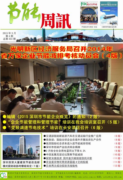深圳市节能专家联合会、《节能技术与市场》编辑部编制的《节能周讯》(PDF电子周报),汇聚每周最新的深圳、国内和国际的节能行业新闻、行业资讯、节能技术、节能知识等,每期免费发送给相关政府部门、行业协会以及数千家节能企业。