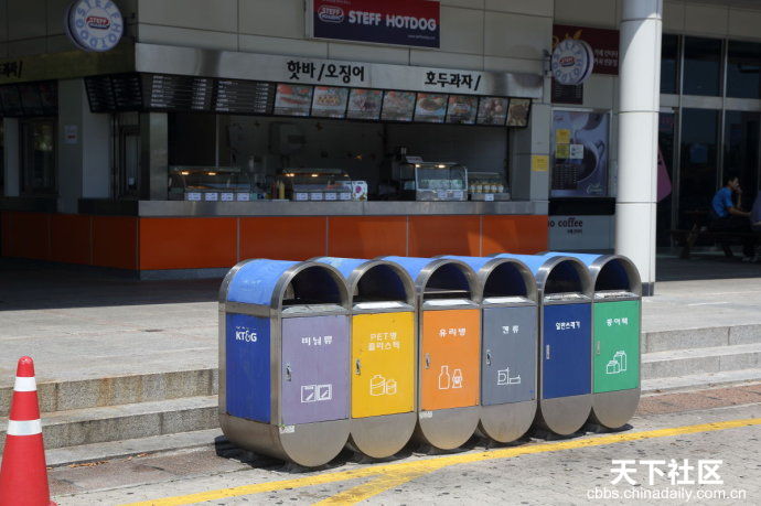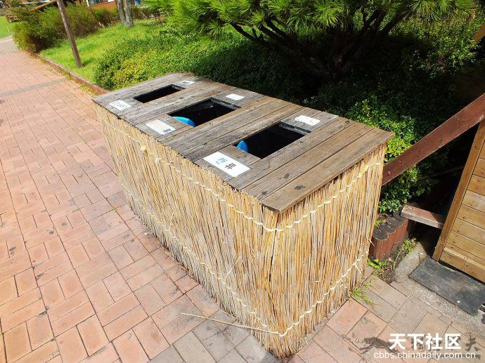 公园内的垃圾箱也属于就地取材,在韩国,垃圾箱的分类也很细化,不是所有垃圾一股脑混在一起。