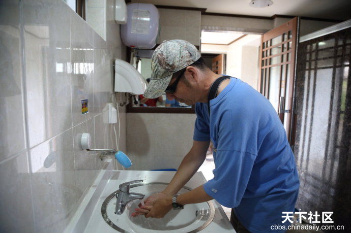 洗手间里,香皂不是浸泡在水淋淋的肥皂盒里,而是被插在水龙头上面,只需用手转转即可,减少了香皂浪费。