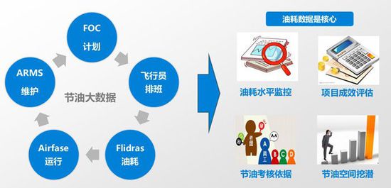 无规矩不成方圆,无数据不成管理。油耗的准确计量不仅是成本管理的需要,也是节能减排项目方案设计、成效评估、持续优化的重要依据。公司充分重视能耗数据工作,搭建了能耗数据采集、统计、分析、应用的完整数据链。首先,计财部每月发布公司能耗监控表,不仅统计跟踪公司水、电、汽油等各项能耗水平,更重要的是实现对每架飞机、每个航段、每名机长油耗水平的持续监控分析。其次,借助精细化的油耗数据深入分析公司机型结构、航段距离、机龄、载运率等因素对油耗水平的影响,努力寻找节能空间。同时,不仅分析油耗变化的情况,还借助Airfase平台从飞机飞行状态和飞行员操作上找原因、想办法。最终,通过计财、运指、飞行、机务等组成的节油核心小组例会机制,共同分析指标异动原因,探讨提出业务改进解决方案,通过以上“监控、分析、研判、应用”四个步骤,让能耗数据从业务中来,最终回到业务去,不仅有分析,还要有提升。