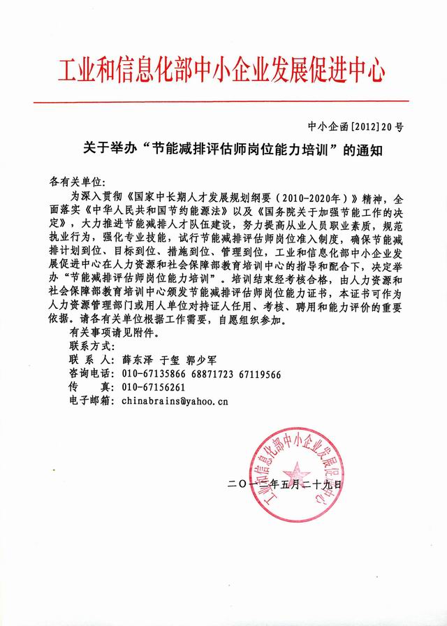 培训结束经考核合格,由人力资源和社会保障部教育培训中心颁发节能减排评估师岗位能力证书,本证书可作为人力资源管理部门或用人单位对持证人任用、考核、聘用和能力评价的重要依据。
