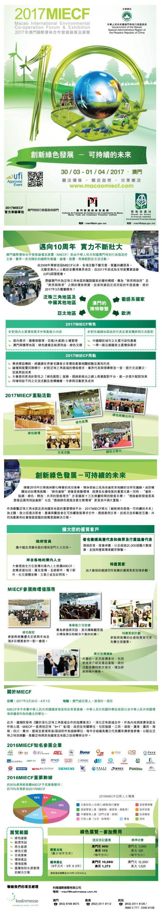 由澳门特别行政区政府主办的2017年澳门国际环保合作发展论坛及展览将于2017年3月30至4月1日在澳门威尼斯人-度假村-酒店 举行。受2017MIECF官方承办单位、澳门贸易投资促进局委托,深圳市节能专家联合会将组团赴澳参展参会。