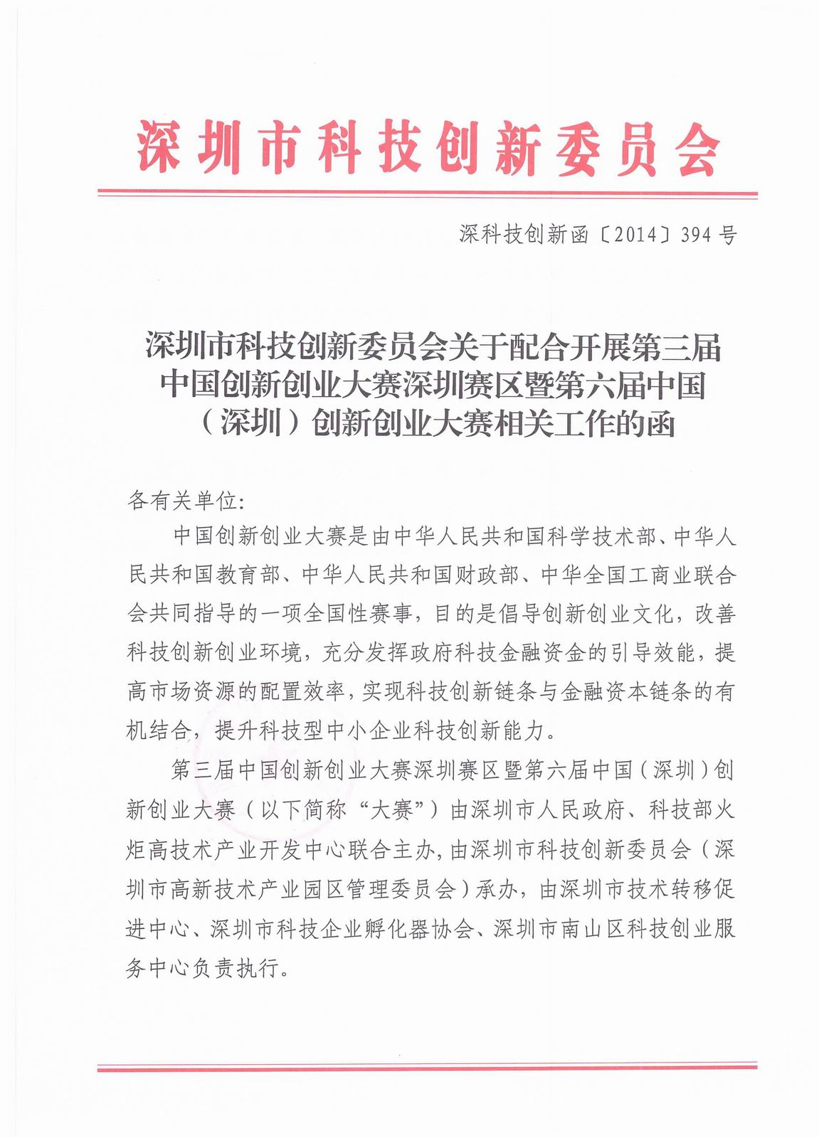 第三届中国创新创业大赛深圳赛区暨第六届中国(深圳)创新创业大赛(以下简称“大赛”)由深圳市人民政府、科技部火炬高技术产业开发中心联合主办,由深圳市科技创新委员会(深圳市高新技术产业园区管理委员会)承办,由深圳市技术转移促进中心、深圳市科技企业孵化器协会、深圳市南山区科技创业服务中心负责执行。