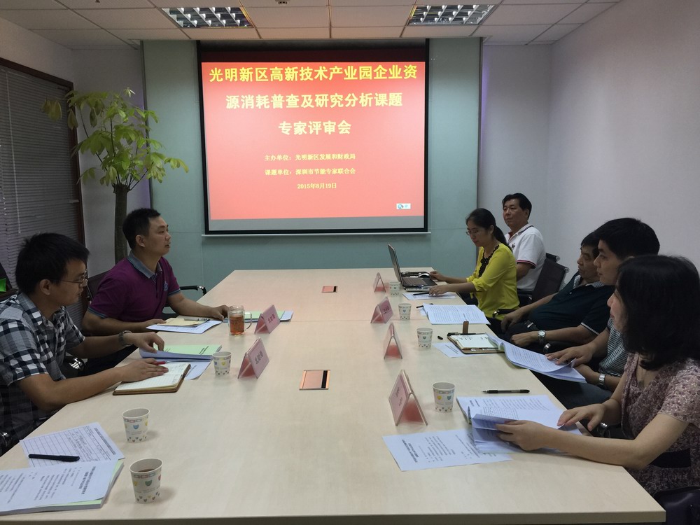 2015年8月19日,深圳市光明新区发展和财政局组织深圳市电气节能研究会王占奎研究员级高级工程师、清华大学深圳研究生院张若兵副教授、深圳市深态环境有限公司张号高级工程师等3位专家,对深圳市节能专家联合会承担的“光明新区高新技术产业园企业资源消耗普查及研究分析课题”进行专家评审。光明新区发展和财政局张鹏科长主持评审会,参会人员还有光明新区发财局章仁,以及深圳节能专家联合会课题组成员。
