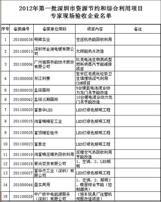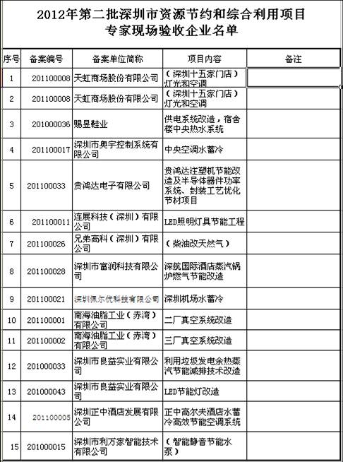受深圳市经济贸易和信息化委员会委托,深圳市节能专家联合会对深圳市资源节约和综合利用项目专家现场验收部分企业名单。