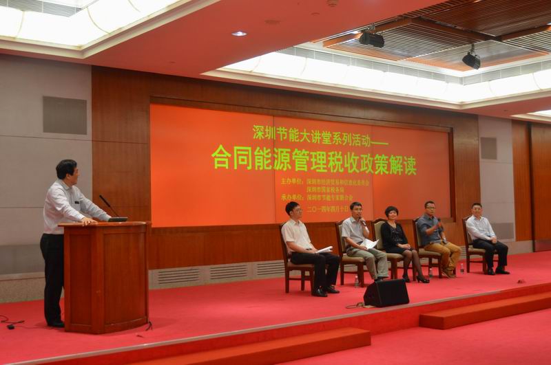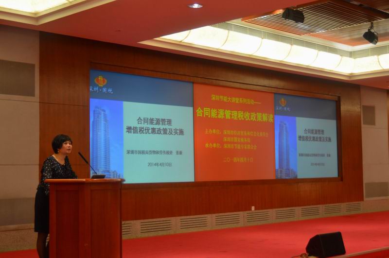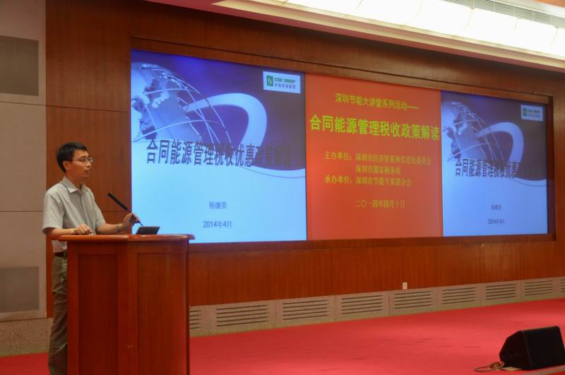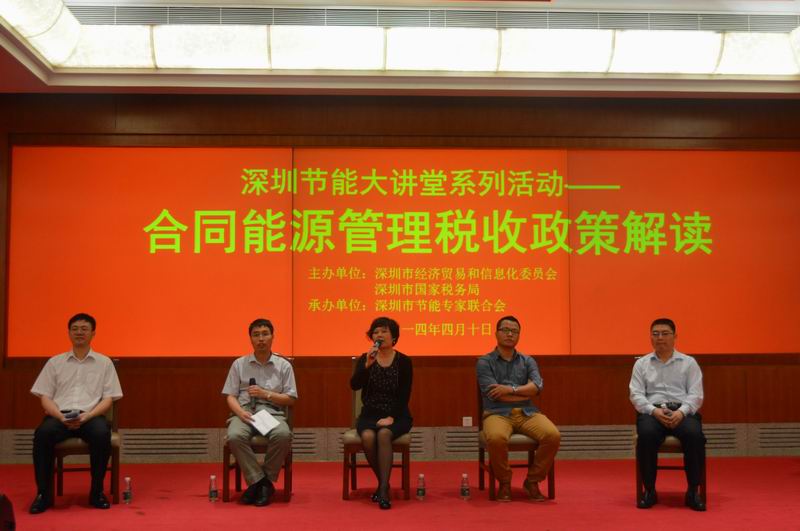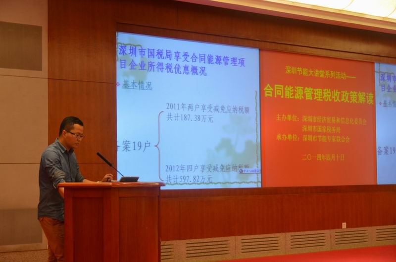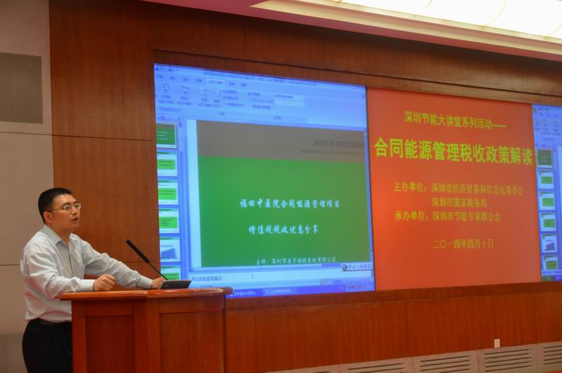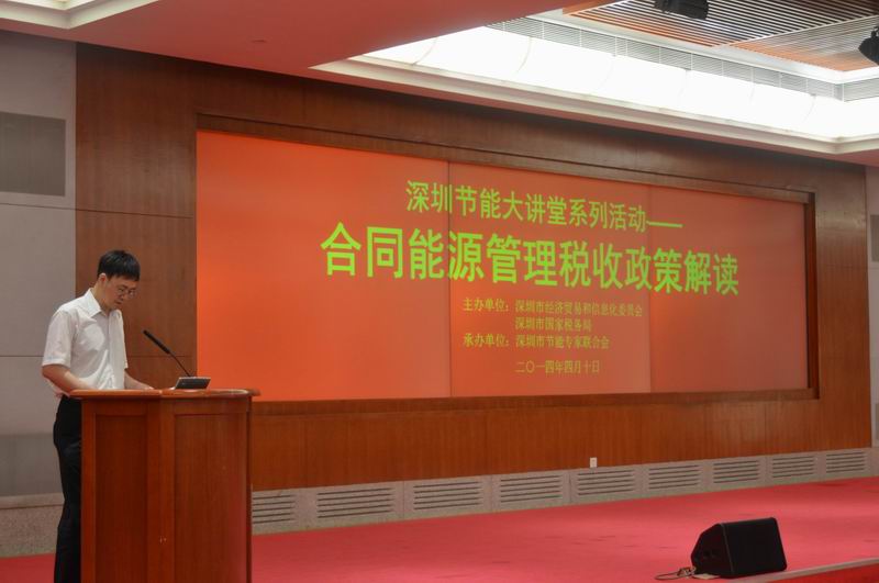 4月10日下午,由深圳市经济贸易和信息化委员会、深圳市国家税务局共同主办、深圳市节能专家联合会承办的“深圳节能大讲堂系列活动——合同能源管理税收政策解读”在市民中心B区多功能厅召开。本次大讲堂全面探讨了合同能源管理税收政策的相关内容,包括财税[2010]110号税收优惠政策、国家税务总局和国家发展改革委公告2013年第77号税收优惠政策出台的初衷和执行情况,深圳节能公司的税务优惠政策,深圳2013年实施合同能源管理项目中提供的应税服务免征增值税的免税户数、免税销售额等问题。