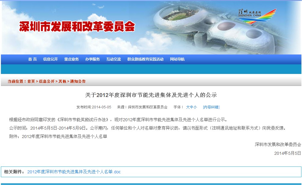 关于2012年度深圳市节能先进集体及先进个人的公示
