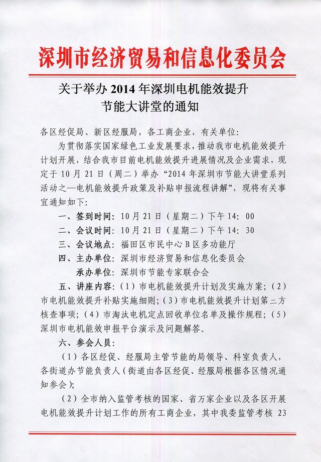 为贯彻落实国家绿色工业发展要求,推动我市电机能效提升计划开展,结合我市目前电机能效提升进展情况及企业需求,现定于10月21日(周二)举办“2014年深圳市节能大讲堂系列活动之—电机能效提升政策及补贴申报流程讲解”,现将有关事宜通知如下: