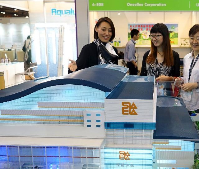 10月29日,观众在展会现场观看垃圾焚烧处理模型