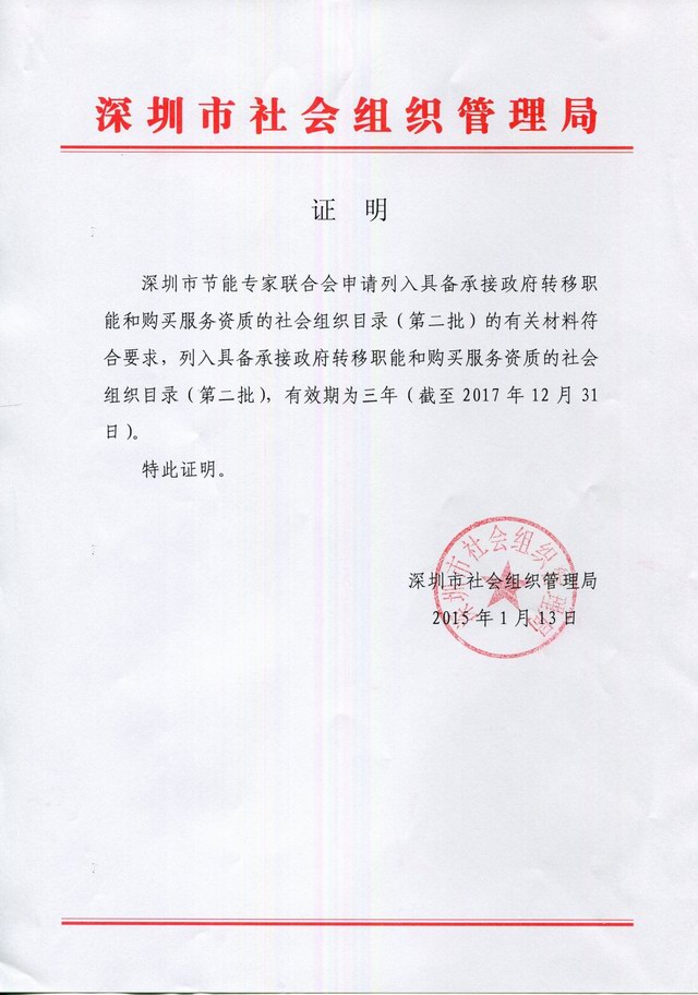近日,深圳市民政局发布《关于公布深圳市具备承接政府转移职能和购买服务资质的市级社会组织目录的通知》(深民函[2015]8号文),深圳市节能专家联合会获得了承接政府职能转移和购买服务资质的社会组织(第二批)资格,有效期为三年(截止至2017年12月31日)。