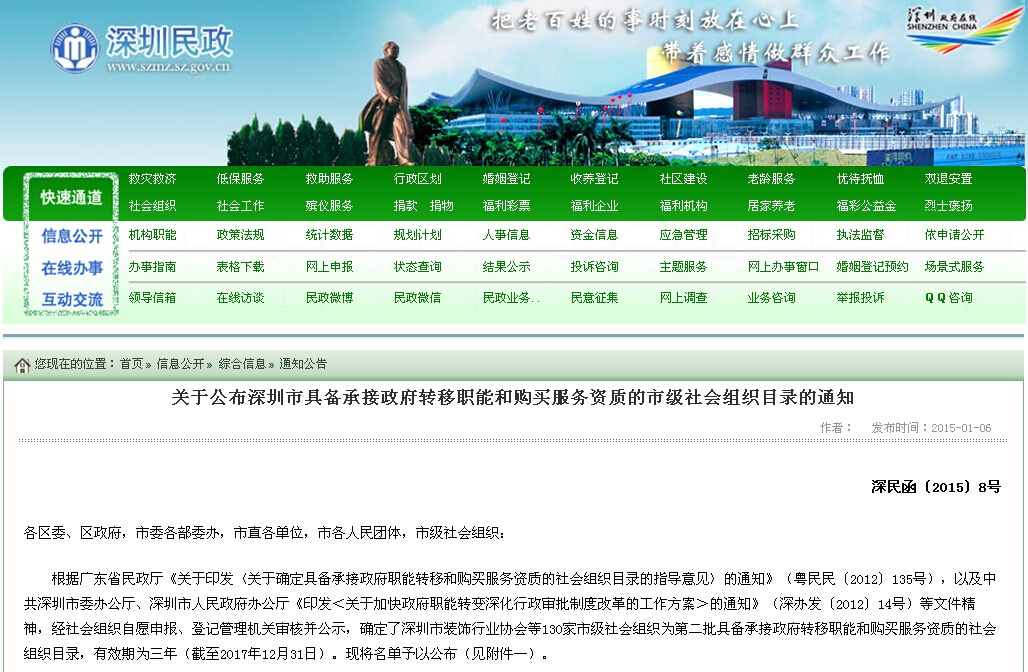 深圳市民政局网站《关于公布深圳市具备承接政府转移职能和购买服务资质的市级社会组织目录的通知》链接:http://www.szmz.sz.gov.cn/xxgk/zhxx/tzgg/201501/t20150106_2773720.htm