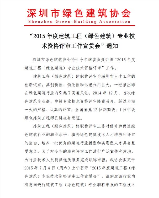 举办2015年度建筑工程(绿色建筑)专业技术资格评审工作宣贯会的通知