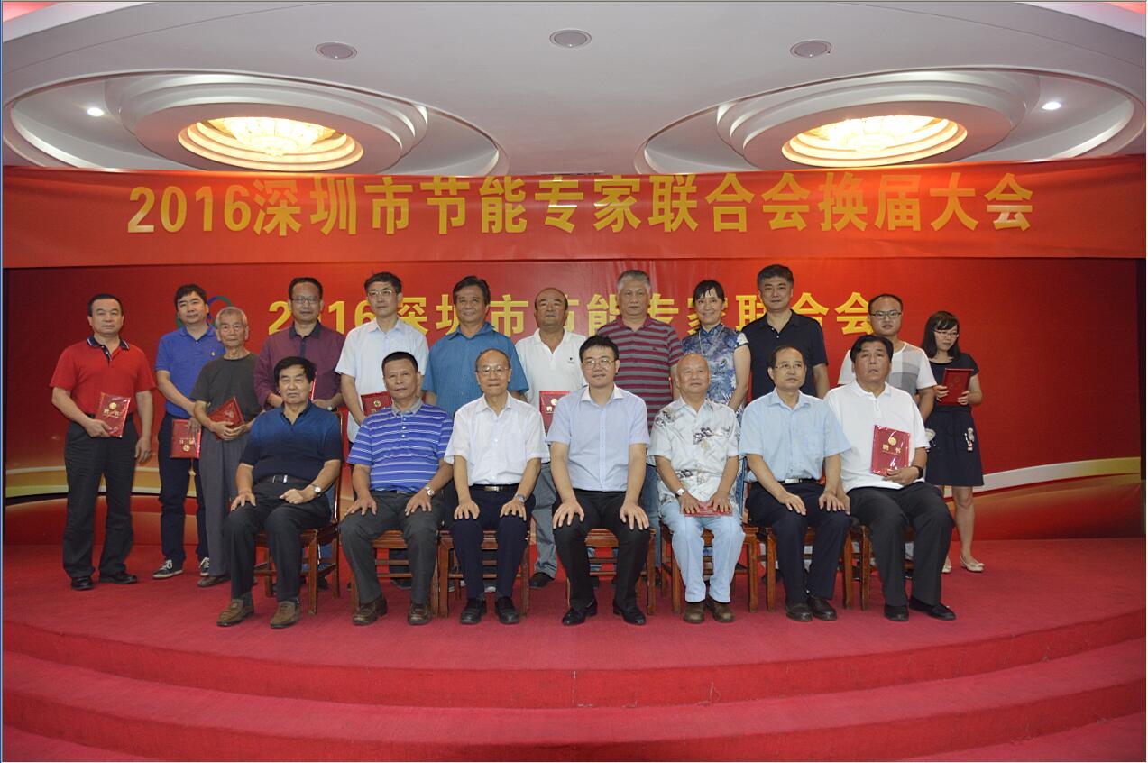 郑健超院士(第一排左三)、袁晓方处长(第一排左四)、深圳市节能专家联合会创会会长王占奎(第一排左一)、新任理事长许武毅(第一排左二)、深圳市节能专家联合会监事徐士斌(第一排右二)、新任理事张文修(第一排右三)、孙长富副理事长兼秘书长(法人)(第一排右一)