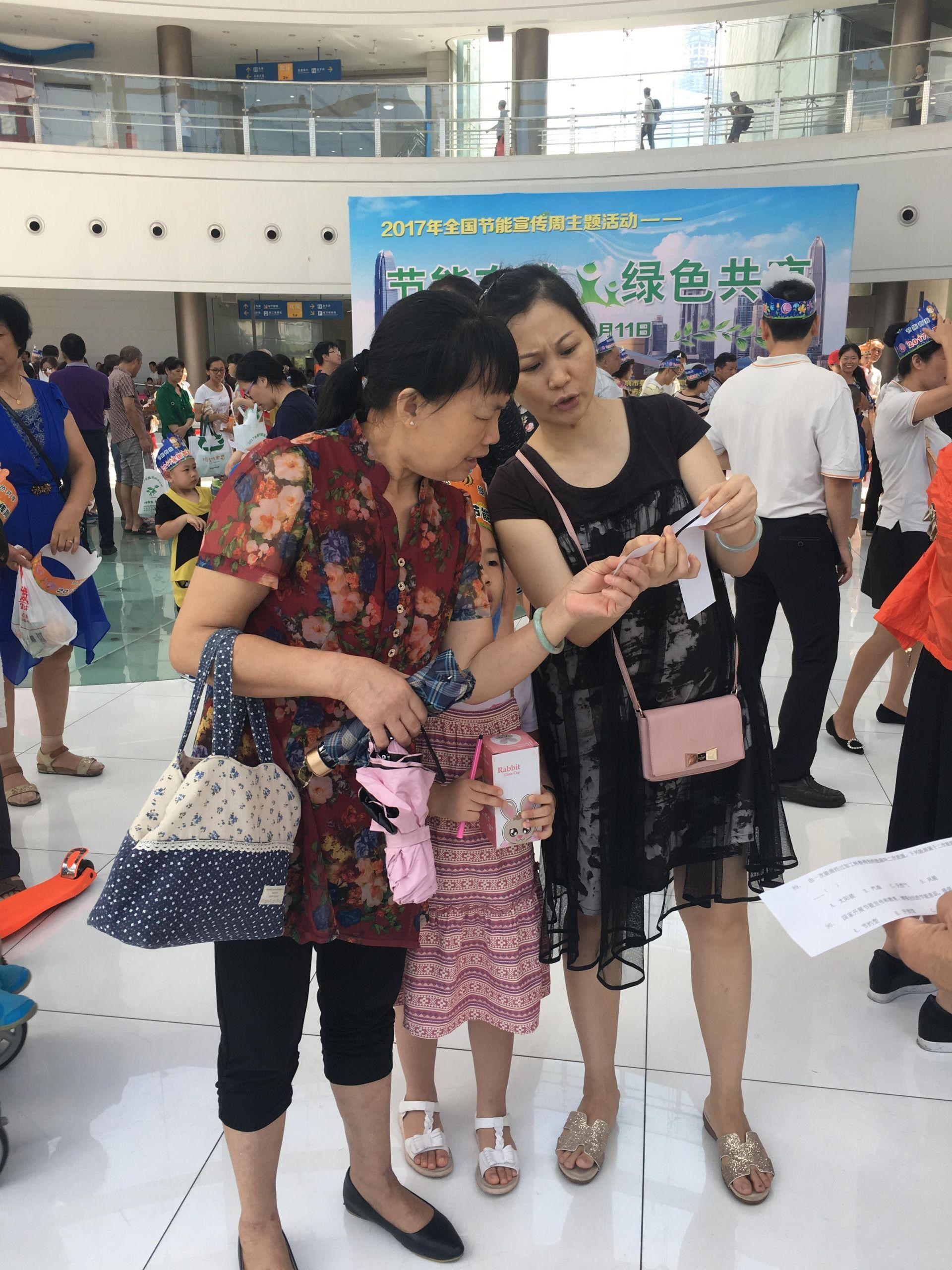 活动现场的市民在讨论节能知识问答题