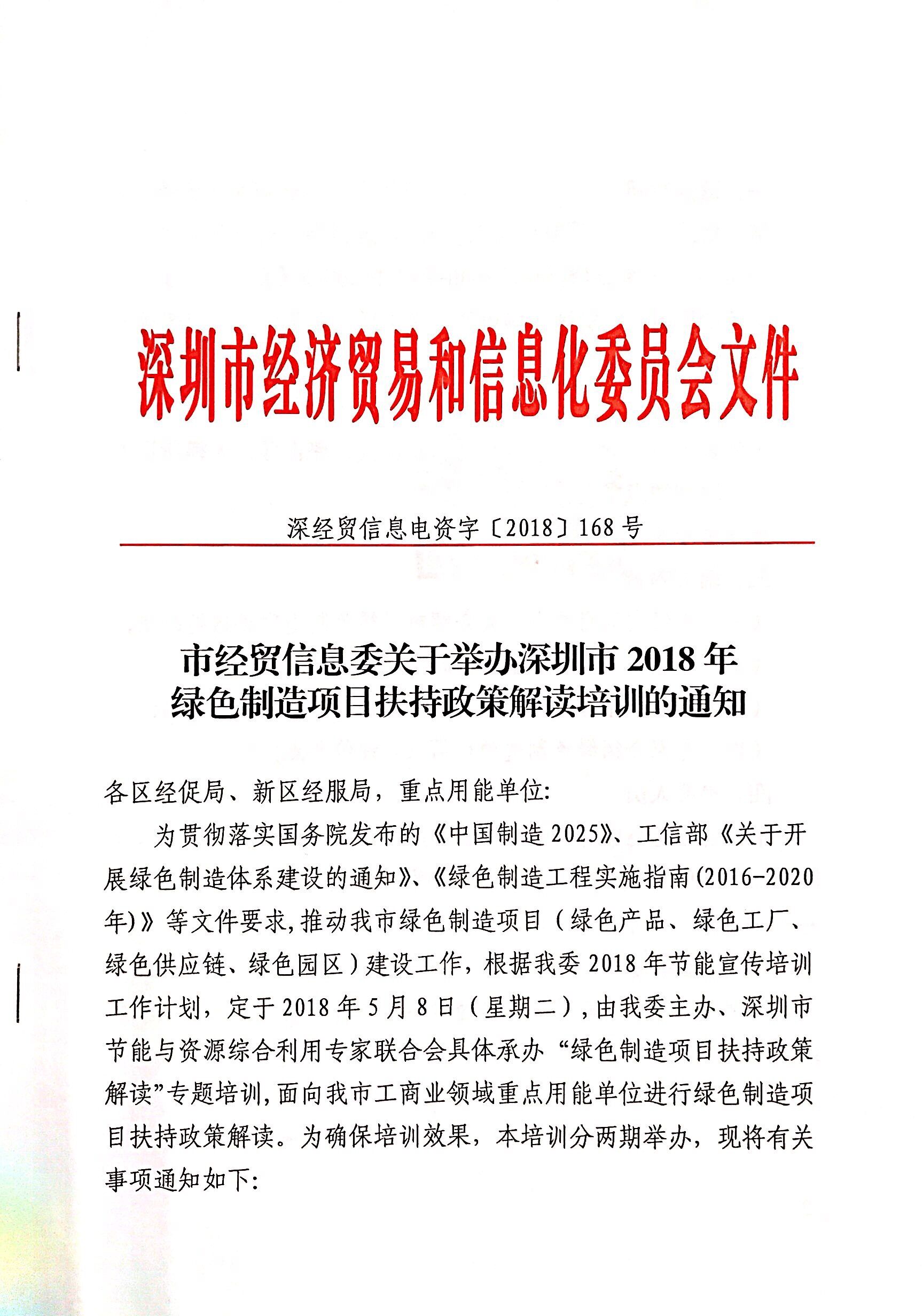市经贸信息委关于举办深圳市2018年绿色制造项目扶持政策解读培训的通知